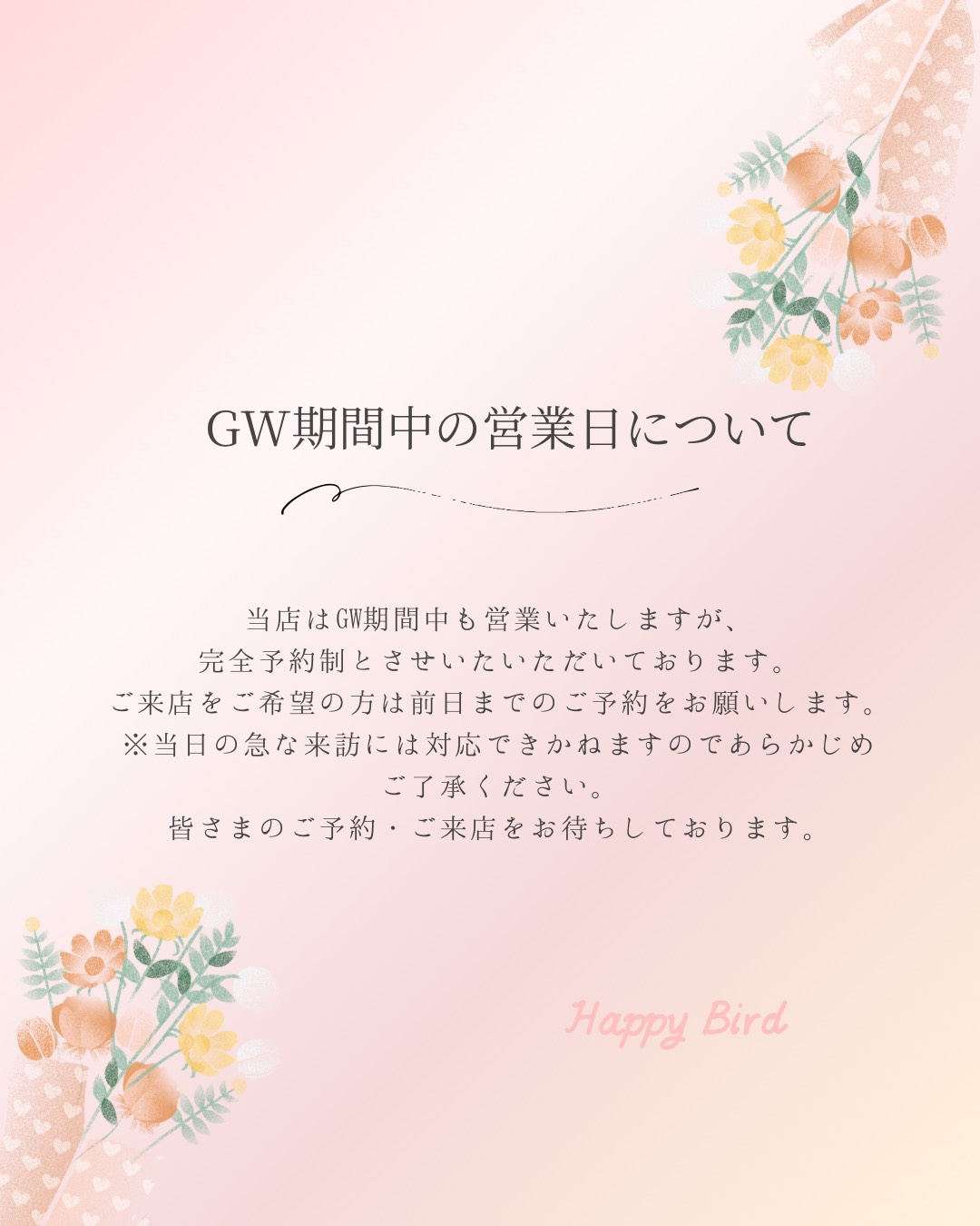 ゴールデンウィークの営業について 2026.04.27 Post Share Hatena Pocket RSS feedly Pin it この記事のタイトルとURLをコピーする Post Share Hatena Pocket RSS feedly Pin it この記事のタイトルとURLをコピーする 定休日変更のお知らせ 前の記事